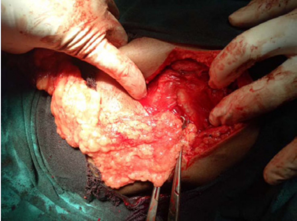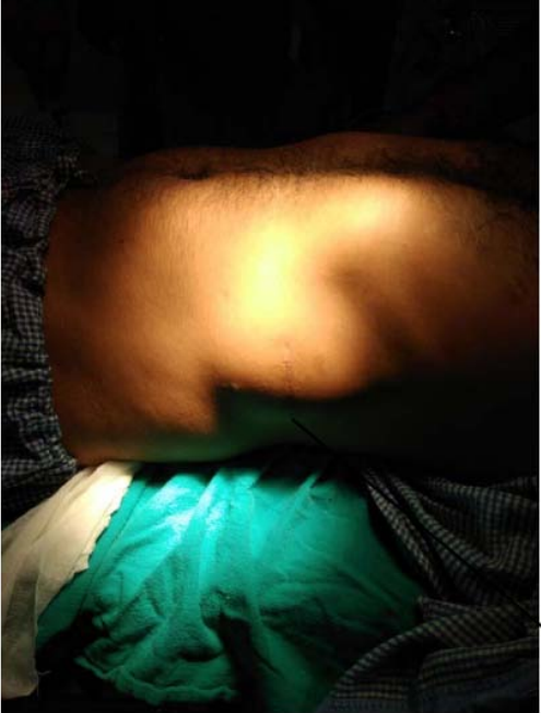 Initially swelling was painless for 5 month which has now started pain for one day. He gave history a swelling over the left upper abdomen for which excision was done but exact nature of swelling was not given nor did patient have previous medical records. No history of nausea, vomiting, abdominal distension. Patient was passing stool, flatus. His B.P was 130/70mmhg, pulse 102/minute. On examination a swelling of around 8x8cm seen in the left lumbar region with an old healed scar over the swelling. Overlying skin was found to be normal. On palpation swelling was tender with no cough impulse and fluctuation. Rest abdomen was soft, no distension, no guarding. USG swelling was done showing collection of around 2x3 cm with edematous subcutaneous tissue. Probable diagnosis of obstructed incisional hernia was made in spite of the USG finding suggesting of abscess. Patient was resuscitated and taken up for exploration under general anesthesia in left lateral position. Intraoperative finding were single hernia sac between the 10th and 11th ribs left side. Hernial sac contained omentum as content (Figure 3).