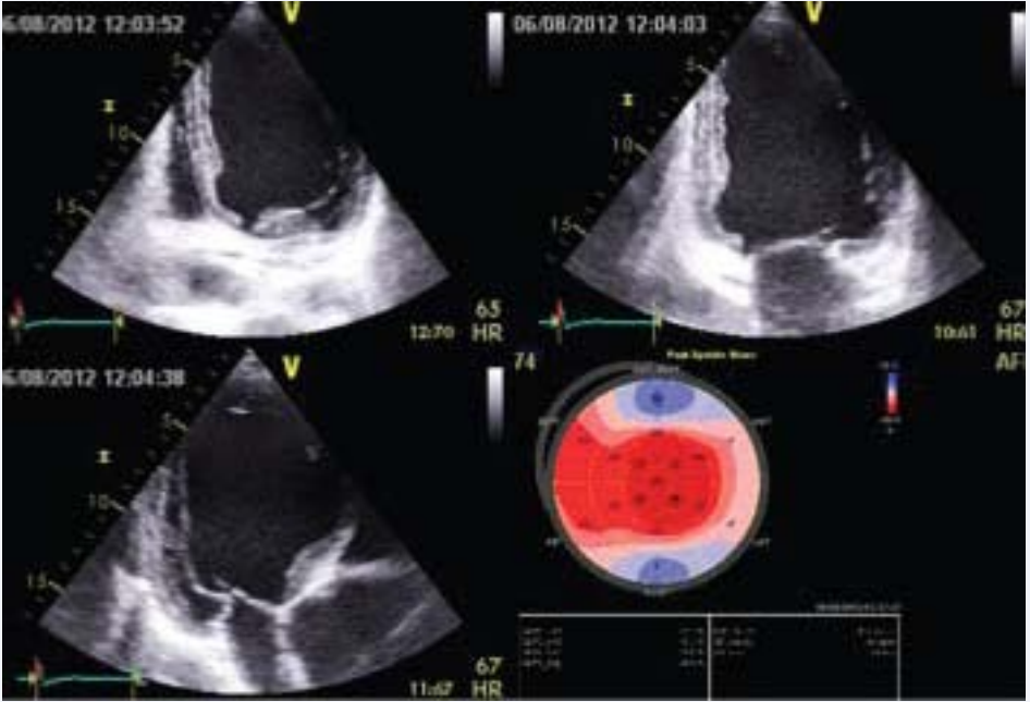 with the following 2D measures: aortic ring = 4.1 cm, Valsalva sinuses = 5.18 cm, sino-tubular junction = 7.1 cm and ascending aorta = 8.7 cm. The left ventricle was enlarged, with ejection fraction (calculated by Simpson’s method and using 3D software) of 41% and global longitudinal strain of -14.4% (Figure 3).