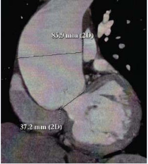 Figure 4c: Computed Tomography Angiography with measurement of the diameter of the aneurysm and aortic ring.