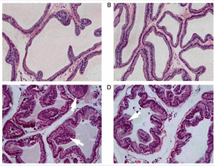 Figure 5 : Morphology of the prostate gland evaluated by hematoxylin and eosin staining. Histological observation of prostate in (A) normal rats, (B) ethanol-drinking rats, (C) chronic non-bacterial prostatitis rats and (D) ethanol-drinking chronic non-bacterial prostatitis rats. Magnification, ×10.