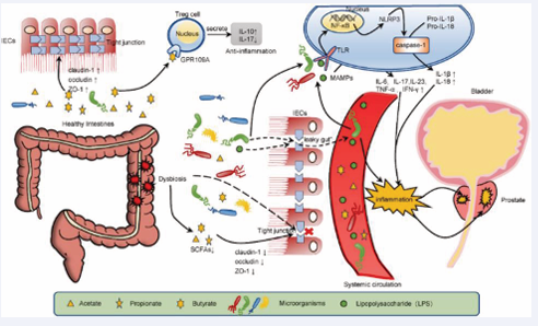 Dysregulation of the gut microbiota significantly reduces the SCFA content in faeces and impairs the integrity of the gut barrier, leading to the translocation of bacteria and bacterial components like as lipopolysaccharide, mediating the development of prostate inflammation through microbe-associated molecular patterns MAMP.