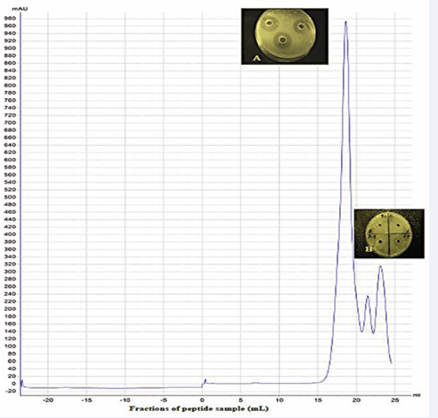 Figure 7 : Chromatogram of gel filtration for antibacterial peptides from Saccharomyces cerevisiae by ÄKTA Pure 25 using Superdex 200 10/300 GL. (A) Inhibition zones of E. coli by peak1, (B) non-inhibition zone of E. coli by peak2 and peak3.
