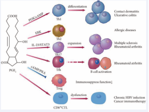 Prostaglandin PGE are characterized by proinflammatory activity, contractions of smoot muscle fiber, vasodilatation and regulation of lymphocyte T cell.