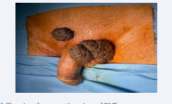 Buschke Lowenstein tumor (BLT) or giant condyloma acuminatum (GCA) is a rare sexually transmitted disease, of viral origin, essentially due to the human papillomavirus, most often type 6 and or 11 and exceptionally type 16 and 18 [1]. This epithelial tumor has still poorly defined relationships with verrucous carcinoma, the histological aspect is benign, although its clinical aspect rather suggests the opposite. It affects men in particular and is characterized mainly by its deep extension, its degenerative potential and its recurrent character after treatment. Surgery is the treatment of choice [2].