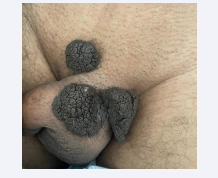 Mr M.S, 54 years old, married, with a history of depressive syndrome, without any notion of homosexuality or multiple partners, who consulted for a budding pubo?scrotal mass. The onset of the symptomatology dated back to 1 year with the progressive installation of a budding scrotal tumor causing tingling.