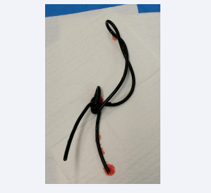 The patient was finally referred to the operating room, an endoscopic treatment was envisaged, during the introduction of the cystoscope a knot in the metal wire at the level of the urethra was observed. The endoscopic extraction attempt failed. We decided to stop the endoscopic procedure.