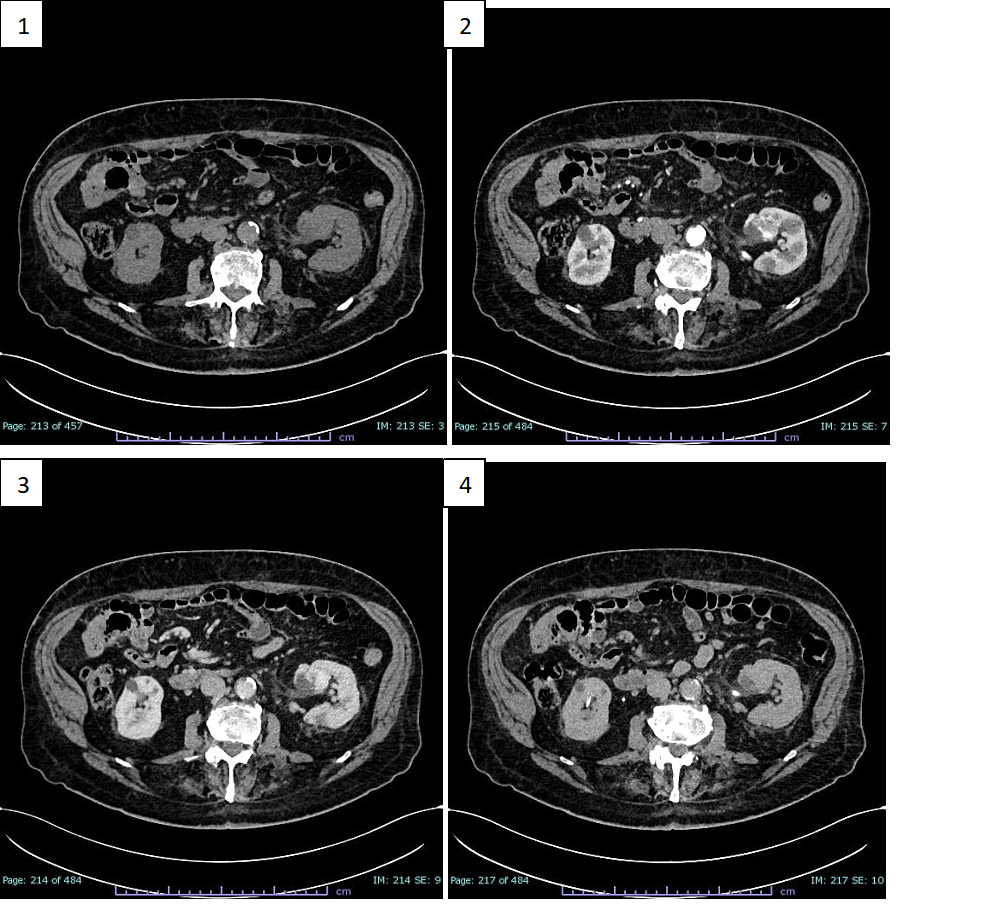 hypodense expansive formation is seen in left renal sinus (32 x 30 mm). 2) Axial CT with CM early arterial phase: the formation shows peripheral annular and pseudonodular enhancement. 3) Axial CT with CM venous phase: the formation shows tendency to homogeneous filling. 4) Axial CT whit CM late phase: the formation shows homogeneously persistent enhancement.
