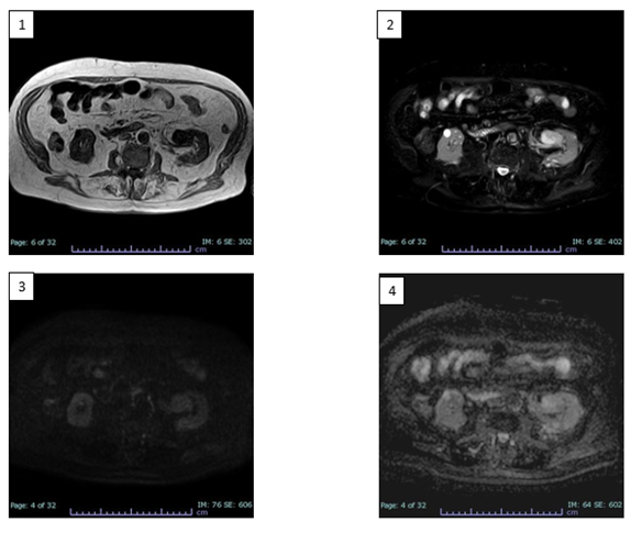 Figure 2: RM scans before and after enhancing with CM. 1) Axial T1 TFE MRI sequence: heteroformation of the left renal sinus showing T1-dependent signal hypointensity. 2) Axial SPAIR T2 MRI sequence: inhomogeneous T2-dependent signal hyperintensity. 3) Axial DWI sB750 MRI sequence: poor diffusion-weighted signal restriction. 4) Axial ADC MRI sequence.