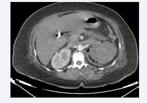 Figure 1: Axial section of an abdominal CT scan after intravenous contrast injection at portal time showing an enlarged left kidney with a nephrographic defect and surrounded by a posterior perirenal collection containing air bubbles. The appearance is compatible with class 3A EPN according to Huang et al.