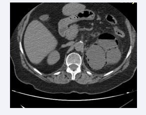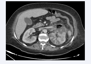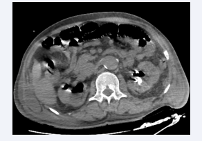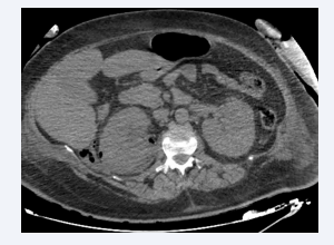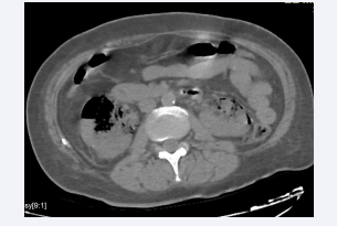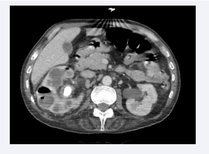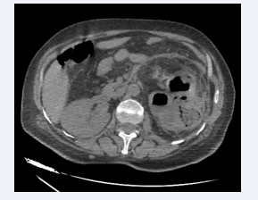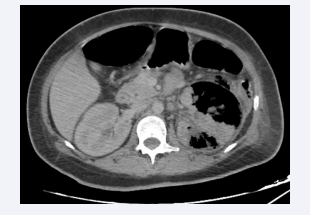 Unfortunately, the warning signs of EPN are non-specific, and cannot be used to differentiate EPN from uncomplicated APN. Palpation of crepitations in the lumbar region, although extremely rare, can provide an important clinical clue to the presence of EPN [2,3]. Unfortunately, this clinical sign was not sought in the observations of our series, which is linked to the retrospective nature of the study. Thus, given the absence of any specific sign, a poor response to antibiotic therapy in a diabetic patient represents the main orienting element towards EPN and should prompt the performance of an emergency abdominal CT scan (Figures 1-10) to confirm the diagnosis and plan treatment [3].