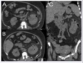 Figure 10: Axial sections (A, B) and coronal reconstruction (C) of an abdominal CT scan without intravenous contrast injection showing air bubbles at the pyloric, intra-parenchymal and peri-renal level of the left kidney. The appearance is compatible with a class 3A left EPN according to Huang et al