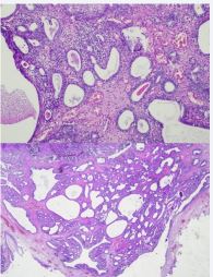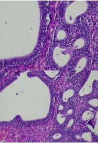 Pathologically, tumor formation is characterized by an adenomatous tubular proliferation made up of elements of variable size and shape, sometimes distended or even cystic. Their epithelium does not show cytonuclear atypia and the interstitial tissue is inflammatory congestive. The base of the tumor bed has an epithelium with a focus of squamous metaplasia (Figures 2,3).