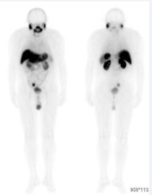 Figure 1 Whole-body PSMA-99mTc scintigraphy images in anterior and posterior projections, demonstrating uptake in the right pelvic lymph node.