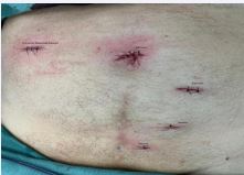 Figure 2 Trocar placement. Two trocars of 10mm (optics and grasper). One trocar 12mm for removal of parts and passage of probe. Two trocars of 5mm for passage of accessory clamps.