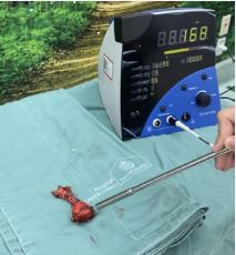 The surgery was performed in a minimally invasive way by laparoscopy. For this procedure, the patient was positioned in horizontal dorsal decubitus. Four small abdominal incisions were made (Figure 2). In the umbilical region was positioned a 10mm trocar for the camera, a trocar 10mm in the left iliac fossa aimed use of bipolar laparoscopic forceps and laparoscopic clip applier, a 5mm trocar in in the above region pubic to a grasper and, for last, a trocar 12mm 4cm to the right of the umbilical trocar through which the long gamma probe was passed, properly protected with sterile plastic. Pelvic lymphadenectomy was performed in the region previously identified by PET/PSMA - the right external iliac region and right common iliac bifurcation - and with the aid of the gamma probe, we identified the two affected lymph nodes. The excision of the lymph node tissue was completely performed (Figure 3). Healthy fat tissue samples were also removed so that ex - vivo the comparison could also be made in obtaining the gamma probe signals and once again confirming the correct removal of the affected tissue. The signal value emitted in the fat tissue serves as an analysis parameter. It is considered as diseased tissue, one that emits at least twice the value of the unaffected tissue.