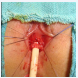 The remaining seven patients had surgical treatment under a general anaesthesia. After a rigorous asepsis of the perineum area, with a Foley’s urethra catheter Ch 6-10 in place, a circumferential resection of the prolapsed urethral mucosa followed by immediate muco-mucous suture, was achieved using the four-quadrant technique (Figure 3-4).