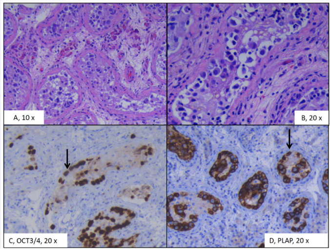 Figure 1: The figure illustrated a contra-lateral biopsy of a man 28 year old with intratubular germinal cell neoplasia which was verify by the positivity of OCT3/4 and PLAP. A. Hematoxylin-eosin showing the tubular structures with atypical cells. B. High scale with atypical germ cells, larger than spermatogonia with prominent irregular nucleus, distinct nucleoli, coarse clumps of chromatin, and abundant cytoplasm, within the seminiferous tubules, located in a single row at the thickened basement membrane. C. Immunohistochemical staining for OCT3/4 showing positivity for germ cells. D. Immunohistochemical staining for PLAP showing positivity for germ cells. Both markers corroborate the finding of intratubular germinal cell neoplasia.