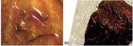 Taxonomy and morphology: Large strongyles are classified under the kingdom animalia, phylum nemathelminthes, class nematoda, order strongylida, superfamily strongyloidae, family strongylidae and subfamily strongylinae. The sex of large strongyles is separate that is female and male. Females are oviparous and eggs are strongyle type. They are reproduced by sexually and they do not have circulatory system (no blood vessel) and respiratory system. Grossly, these parasites look robust dark red worms (Figure 1a), which are easily seen against the intestinal mucosa. They have cylindrical unsegmented shape, body cavity, intestine with anus, nervous system and some has prominent leaf crown surrounding the mouth opening [39].