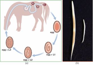 Figure 5 The life cycle of Oxyuris equi (a); and Adult female & male worms (b) (Source: [40]).