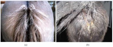 (a) = itching and dermatitis of the tail root; (b) = massive O. equi egg excretion with cream-colored, dried egg clusters.