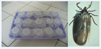 Thirty engorged female ticks were collected from dogs then were weighed individually using digital scales. After that, each individual was put in a plastic jar (tube) with a perforated cover and coated with cotton fabric to prevent the hatching from crawling larvae out and placed in a plastic tray (Figure 1). Each individual tube with an engorged tick was labeled and then kept for 30 days in the laboratory at room temperature without any feeding to allow them to lay their eggs.