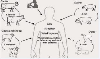 Human infection typically occurs through the consumption of unpasteurized dairy products such as milk and cheese, direct contact with infected animals, or handling of Brucella-contaminated materials in laboratory settings. Transmission can also occur via exposure to the skin or mucous membranes during animal parturition or abortion, especially among those who consume raw milk or engage in risky animal handling practices [9].