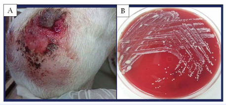 Figure 2: Caseous lymphadenitis lesions in Boer cross doe from a farm located in Selangor region, Peninsular Malaysia; A) Mandibular abscess; B) Blood Agar culture showing colonies of Corynebacterium pseudotuberculosis.