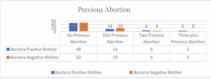 Analysis of the data collected at the Clinic for Gynecology and Obstetrics at the University Clinical Center in Prishtina, from January 1, 2024, to December 31, 2024, revealed significant differences between the clinical presentations and laboratory findings of the study and control groups. As the first parameter, previous miscarriages were considered. The distribution of previous miscarriages was relatively balanced between the groups; however, a notable distinction emerged: among bacteria negative mothers, none had experienced more than three miscarriages, whereas among bacteria-positive mothers, five had a history of more than three miscarriages (Figure 1).