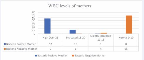 The leukocyte count among mothers in the study group was significantly elevated: 57 participants had values above 21, 15 had elevated levels ranging from 16 to 20, and one had a slightly elevated count between 11 and 15. Notably, none of the participants in the study group had normal leukocyte levels. In the control group, only one pregnant woman exhibited an elevated leukocyte count, four had slightly elevated values, and 68 had normal leukocyte counts (Figure 3).
