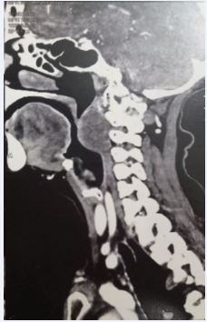 71-year-old women consulted with medial dysphagia during 13 months. She reported a foreign body sensation and actually the perturbance was important and imposed a modification of food ingrain (liquid foods). The global status of this patient is good (memory, hemodynamic constants, cardiac and renal functions). She reports an amigrissement of 8 kg without perturbance (asthenia). Clinical exam revealed a 5 X 4 cm mass in the posterior part of oropharyngeal way. Mucous was well without ulceration. Palpation was not pulsate and not painful. Fibroscopy not shows a nasopharyngeal or hypo pharyngeal extension. The lesion was strictly medial without lateral (para pharyngeal extension). Cervical and cranial nerve evaluation was normally. Enhanced computed tomography showed limited tumor of oropharyngeal space (Figure 1,2).