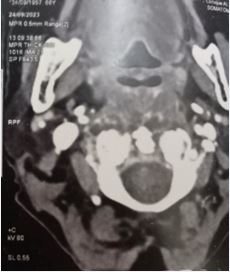 MRI revealed a 5X4, 5 cm mass occupied retro oropharyngeal space without osteolysis (cervical spine) (Figure 3,4).