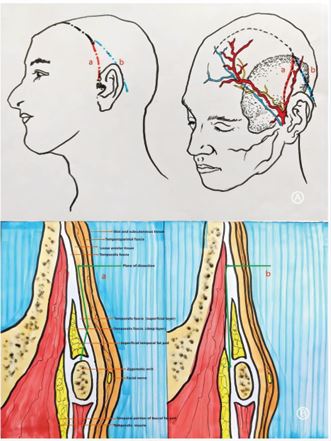 Figure 1: Comparison between traditional coronal incision approach and novel scalp coronal incision approach. (1a) The traditional coronal incision approach. (1b) The novel scalp coronal incision approach.
