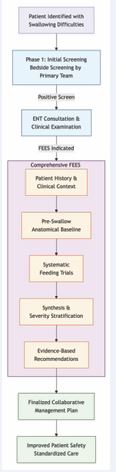 Background: Dysphagia is a prevalent and high-risk condition in hospitalized patients, with inconsistent assessment practices contributing to adverse outcomes like aspiration pneumonia. While Fiberoptic Endoscopic Evaluation of Swallowing (FEES) is a gold-standard diagnostic tool, its effectiveness relies on systematic execution and interdisciplinary collaboration.