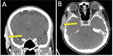 Figure 1 Contrast-enhanced CT head demonstrating right temporal scalp recurrence in A) coronal; and B) axial planes.