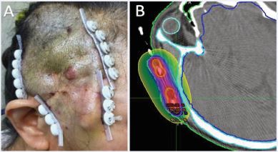 Figure 2 Interstitial implant encompassing the right temporal lesion and adjacent scalp in (A) post op photo and (B) implant dosimetry with the 200% prescription dose in Red, the 150% in orange, the 100% in blue and the 50% in yellow, and the Clinical tumor volume (CTV) in purple.