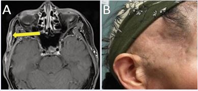 Figure 3 (A) Contrast-enhanced face MRI four months post-treatment demonstrating significant treatment response. (B) Treated right temporal scalp at one-year post-treatment demonstrating excellent cosmetic outcome without clinical evidence of disease recurrence.