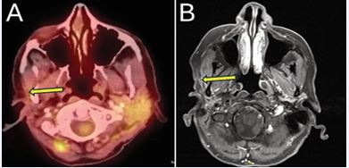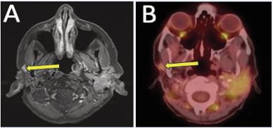 Figure 4 (A) Contrast-enhanced neck MRI demonstrating enlarging soft tissue enhancement in the right parotid bed, suspicious for local recurrence. (B) PET/ CT confirmed increased FDG activity associated with recurrence.