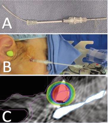 Figure 5 Interstitial treatment device consisting of a CT contrast wire placed within the inner afterloading catheter within the coaxial introducer needle (A) prior to implantation and (B) implanted and secured in place. (C) Implant dosimetry with the GTV in purple, Skin in pink, mandible in gray, 200% prescription dose in red, 150% dose in orange, 100% dose in blue and 50% dose in yellow. As demonstrated, the majority of the CTV is receiving 200% dose. The 100% prescription dose is maintained off the skin, and the 50% dose is maintained off the mandible.