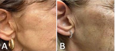 Figure 6 Treated area with mild hyperpigmentation at (A) 3 months post treatment, which remained stable through (B) 4 years post-treatment.