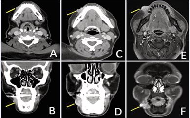 Figure 8 Recurrent right lower lip ACC demonstrated on contrast-enhanced face CT in (A) axial; and (B) coronal views. Repeat imaging one year later with interval growth, in (C) axial; and (D) coronal views. Contrast-enhanced face MRI four months later showing continued progression in (E) axial; and (F) coronal views.