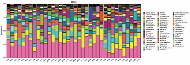 The most prevalent genera associated with adenoids (Streptococcus, Haemophilus and Neisseria) were also found in oropharyngeal microbiome samples. In addition, Prevotella, Actinomyces, and Gemella were also universally prevalent. The relative abundance of bacterial genera in individual samples is shown in Figure 1