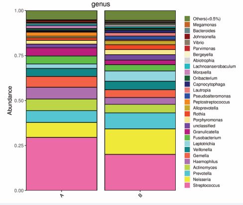 Figure 2 shows the mean relative abundances of the bacterial taxa associated with the top 30 genera at each site. In the preoperative groups (group A), the most abundant bacterial genus was Streptococcus (29.94%), followed by Neisseria (8.31%), Prevotella (6.57%), Haemophilus (6.56%), Actinomyces (6.45%) and Gemella (6.04%) (Figure 2). Streptococcus (20.07%), had the highest abundance in the postoperative samples of the AH children, followed by Neisseria (14.16%), Prevotella (8.91%), Leptotrichia (5.76%) and Actinomyces (4.72%) (Figure 2).