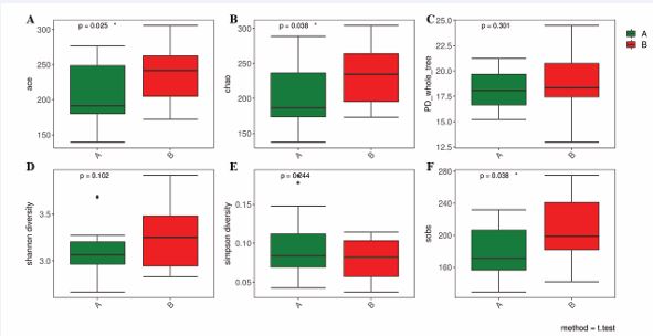 Figure 3 Alpha diversity of the microbial community in each group analyzed by the Chao index (A), ACE index (B), PD_whole_tree (C), Shannon index (D), Simpson index (E) and Sobs index (F). Boxes represent the 25th to 75th percentiles; the bar indicates the media. (Green: preoperative group; Red: postoperative group).