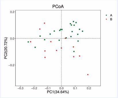 Figure 4 Comparison of the β diversity of the microbial community in each group (A: preoperative; B: postoperative). Plots of weighted UniFrac-based PCoA in each group.