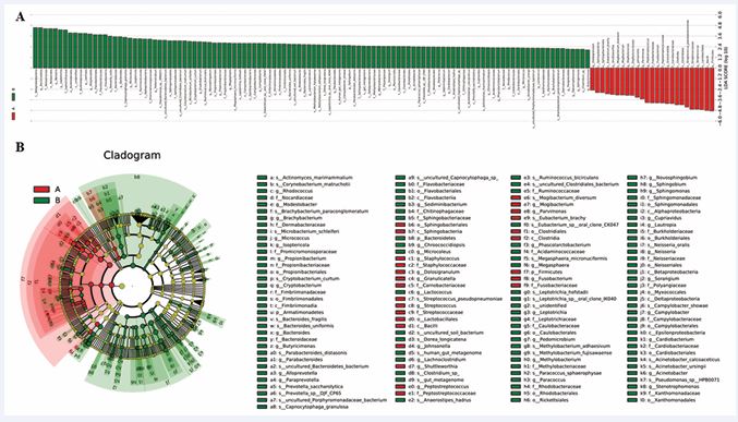 Figure 5 Linear Discriminant Analysis (LDA) integrated with effect size (LEfSe) (red: preoperative; green: postoperative). (A) Differences in abundance between the two groups. (B) Cladogram indicating the phylogenetic distribution of microbiota correlated with the preoperative and postoperative groups.
