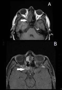 Cranial magnetic resonans angiography and orbital MRI examinations were fulfilled to exclude potential cavernous sinus thrombosis and orbital involvement for the patient. Soft tissues signals compressing rectus muscle, optic nerve, cavernous sinus and optic vein softly were exist during cranial MRI. Contrast involvement depending on infection effects optic nerve, surrounding soft tissue, ethmoid mucosa and around cavernous sinus on the right side was observed during T1-weighted MRI sequence after contrast material (Figure 2 A,B).