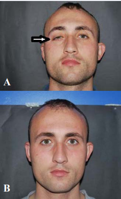 As a result of infectious diseases consultation, it is decided to prescribe Vancomycin 3x1 and Flagyl 2x1 as parenteral antibiotherapy. Ptosis was completely regressed in the fifth day of treatment. Moreover complaints about purulent nasal secretion and headache were decreased. WBC, sedimentation and CRP values reached normal level on blood table in the tenth day of treatment. The patient was discharged from hospital after 10 days of medical treatment (Figure 3 A,B).