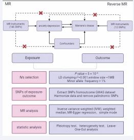 Meniere’s disease (MD) is currently recognized as a common pathway for symptoms characterized by rotational vertigo, sensorineural hearing loss, tinnitus, and swelling or pressure in the ear [1]. The annual prevalence of MD has been reported to be between 10.4 and 513 cases per 100,000 people [2], and the incidence of MD varies widely globally. Patients with long-term MD recurrence and vertigo tinnitus are prone to further depression and cognitive function changes, which greatly affect the quality of life of patients and damage their physical and mental health [3].Therefore, further identification of risk factors for MD is critical for its prevention and treatment. MD is a chronic and progressive disease, and lifestyle changes are essential to prevent it. The association between anxiety-depression and MD is unclear. Anxiety depression are currently considered as risk factors for a variety of chronic diseases [4], and MD can also affect the occurrence of anxiety-depression [5]. Anxiety-depression is considered a key risk factor for MD, reducing stress and keeping a positive mood in the medical recommendations for MD are thought to play a role in preventing MD relapse. Some otolaryngologists believe that patients with MD suffer from anxiety disorders and that stress can negatively affect the onset and progression of the disease [6]. They note that psychological factors play a major role in the course of the disease. Some authors have proposed a psychosomatic etiology to explain how vestibular dysfunction can lead to anxiety, fear, social phobia and depression [7]. However, in past literature, it was found that there were not enough randomized controlled trialsto provide support or refute the causal relationship between MD and anxiety-depression at the genetic level [8]. Studies have shown that anxiety-depression can contribute to disease activity, response to treatment and risk of relapse [9]. To elucidate the association between anxiety-depression and MD guiding lifestyle adjustment in MD, this study aimed to determine the causal relationship between anxiety-depression and MD through Mendelian randomization (MR).