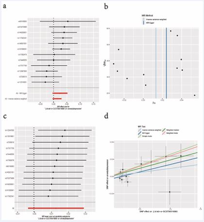 Figure 5 Causal relationship between MD and anxiety-depression (a) Forest plot of the effect of anxiety-depression on MD (b) Funnel plot of the effect of anxiety-depression on MD (c) Leave-one-out plot of the effect of anxiety-depression on MD (d) Scatter plot of the effect of anxiety depression on MD (c) Leave-one-out plot of the effect of anxiety-depression on MD (d) Scatter plot of the effect of anxiety-depression on MD
