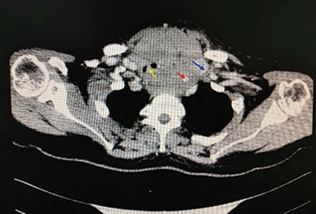 Figure 1 The lesion invades and compresses the trachea, resulting in luminal stenosis, and extends through the membranous portion into the tracheal lumen, partially obstructing the airway (yellow arrow). The left common carotid artery is completely encased by the tumor (red arrow), while the left internal jugular vein is infiltrated with luminal compression and stenosis (blue arrow).
